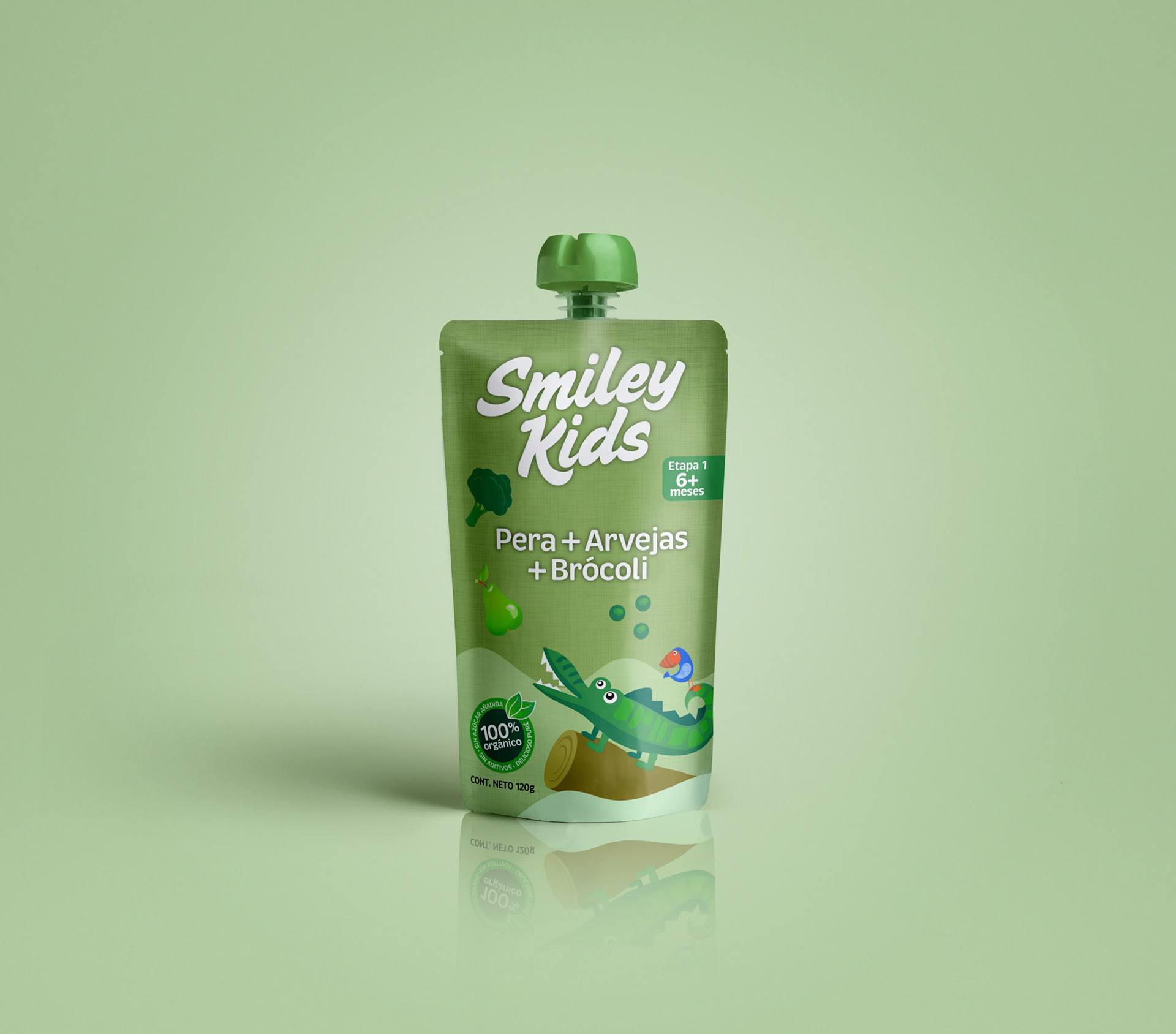 Smiley Kids food pouch designs for Chilean baby food startup. Inclusive of Smiley Kids typographical device, colour coding, baby animal character designs and all finished artwork for production.